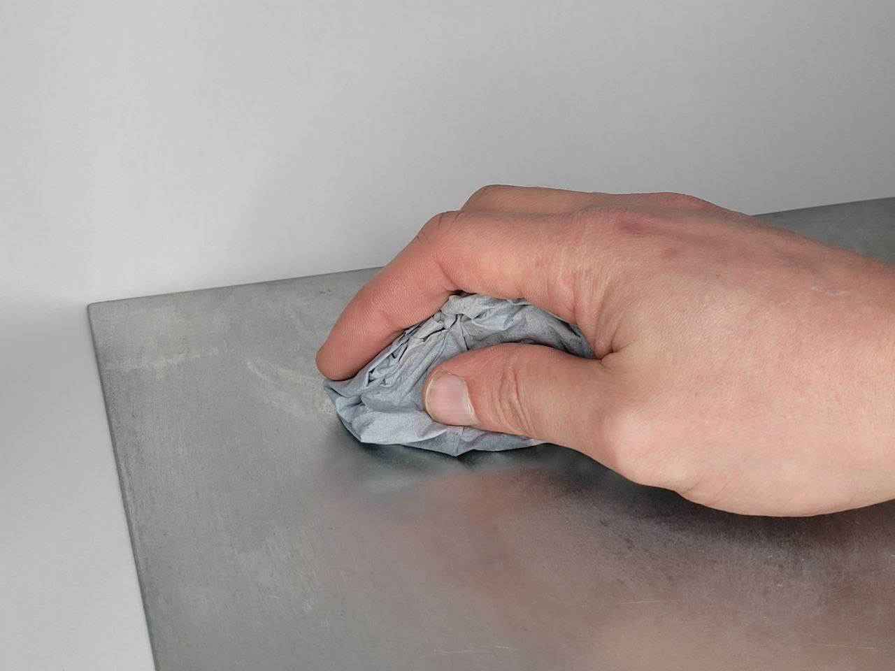 Use a tack cloth or a lint-free cloth slightly dampened with a